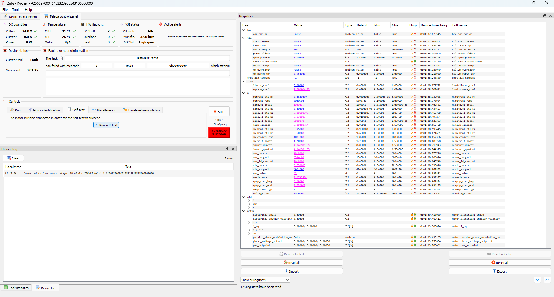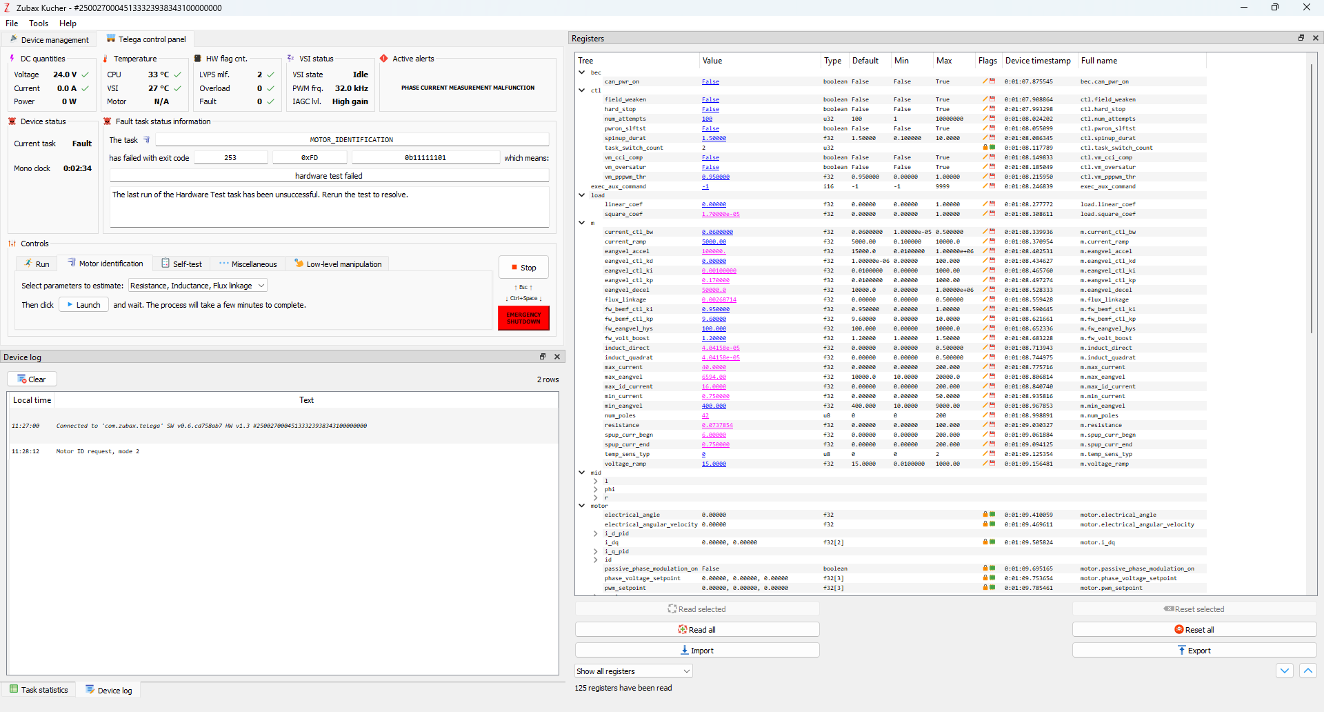 I have run a self-test and then tried a motor identification procedure (mode 2: Resistance, Inductance, Flux linkage), but that also fails with: